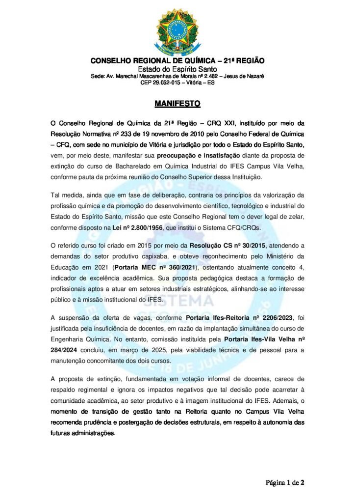 Manifesto quanto a preocupação e insatisfação diante da proposta de extinção do curso de Bacharelado em Química Industrial do IFES Campus Vila Velha 19 de setembro de 2025adminInformativo, Notícias